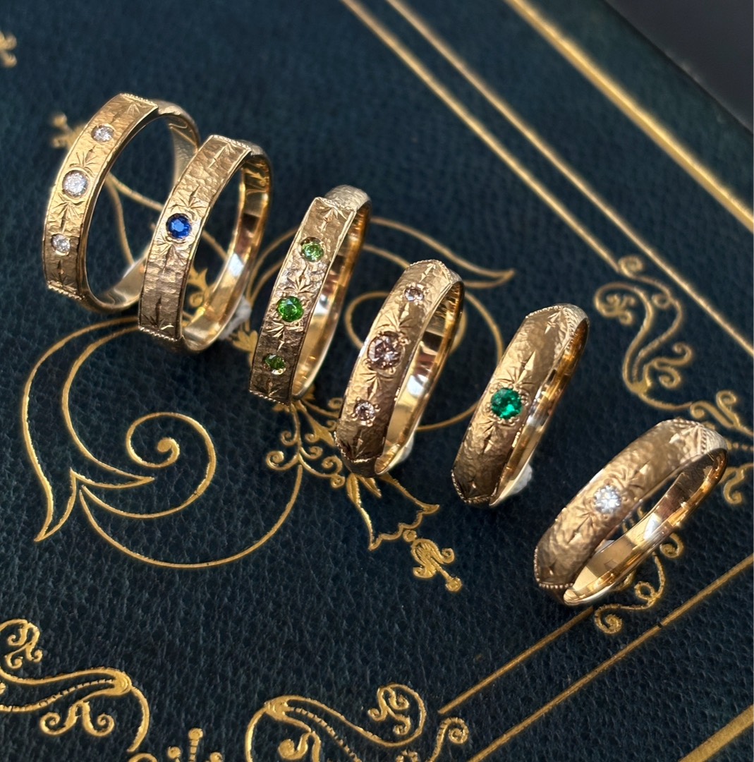 留められた宝石、手彫りの表情によって同じモチーフでも異なる個性が生まれます。